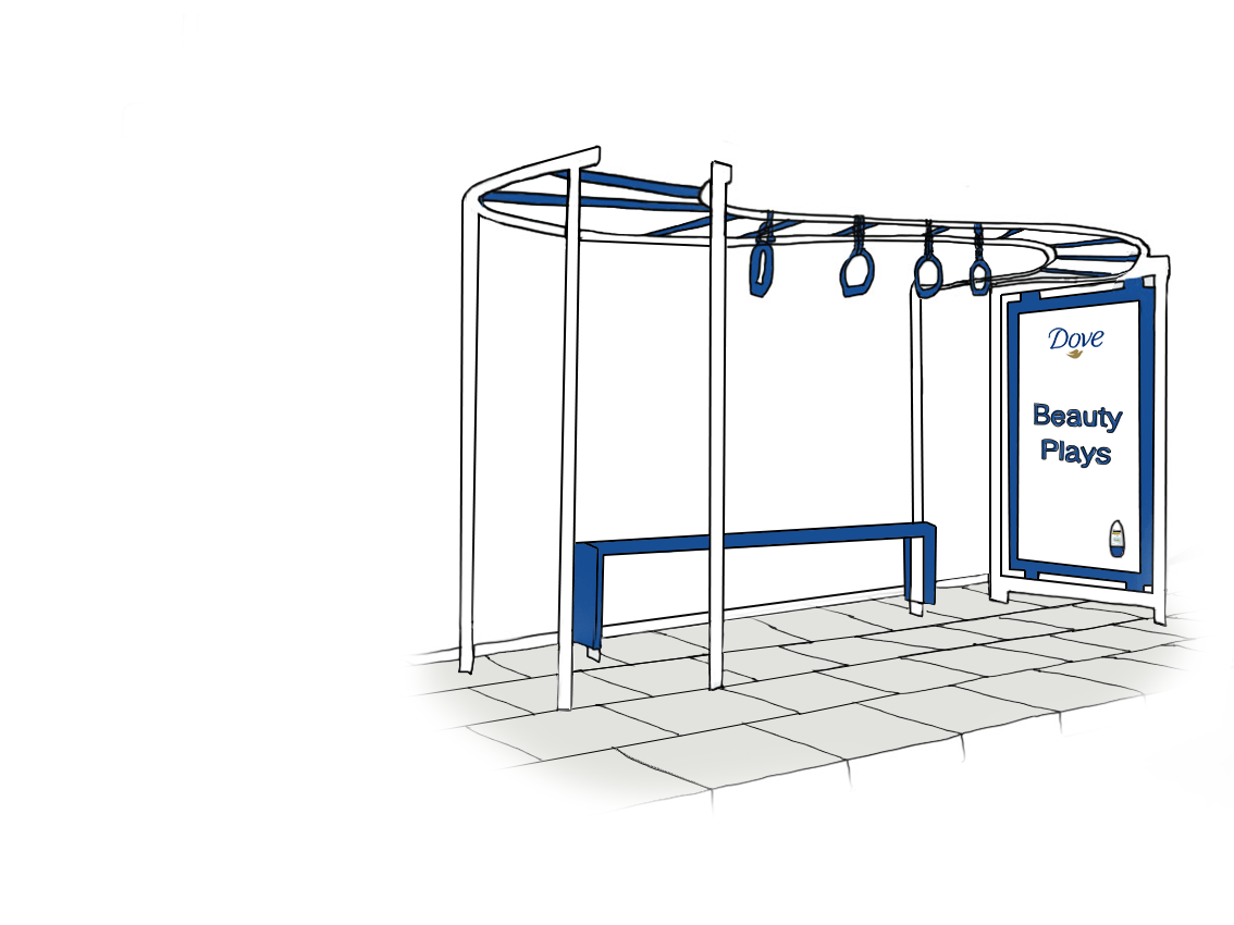 Below is an ambient installation concept of a bus stand which is also a playground jungle gym. With a supporting advertisement stating 'Beauty Plays', which means that people are more playful when they are confident within themselves. This addresses the age-old issue of women feeling afraid of showing their armpits in public and on public transport because they feel like it's an ugly body part. This fun jungle gym encourages people to play and embrace their inner confidence with Dove.