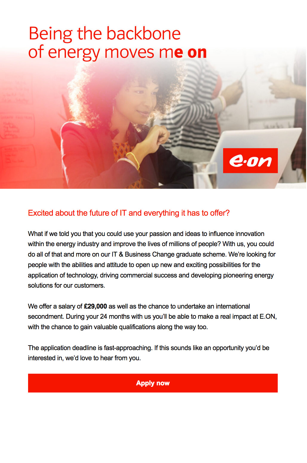 Agency: Tonic Agency Ltd Client: E.ON Media: HTML My role: Copywriter Insight: E.ON provide university students with the opportunity to take on summer placements, with the chance to move around various departments. Task: With a January deadline for summer placement applications, E.ON came to us to send out a reminder in light of the New Year theme. E.ON also have a ‘....moves me on’ tagline at the end of each of their headlines. This is associated with whatever excites an employee to work for E.ON. Create a headline to support the HTML I wrote directed towards students. Idea: With New Year’s approaching, I wanted to add a positive, celebratory essence to the email and supporting headline. Therefore I decided to suggest a toast to the coming year and what this summer placement could contribute towards a student’s future career. A summer that moves them on to bigger and greater opportunities. Below are a few examples of HTMLs I wrote for various E.ON career opportunities.