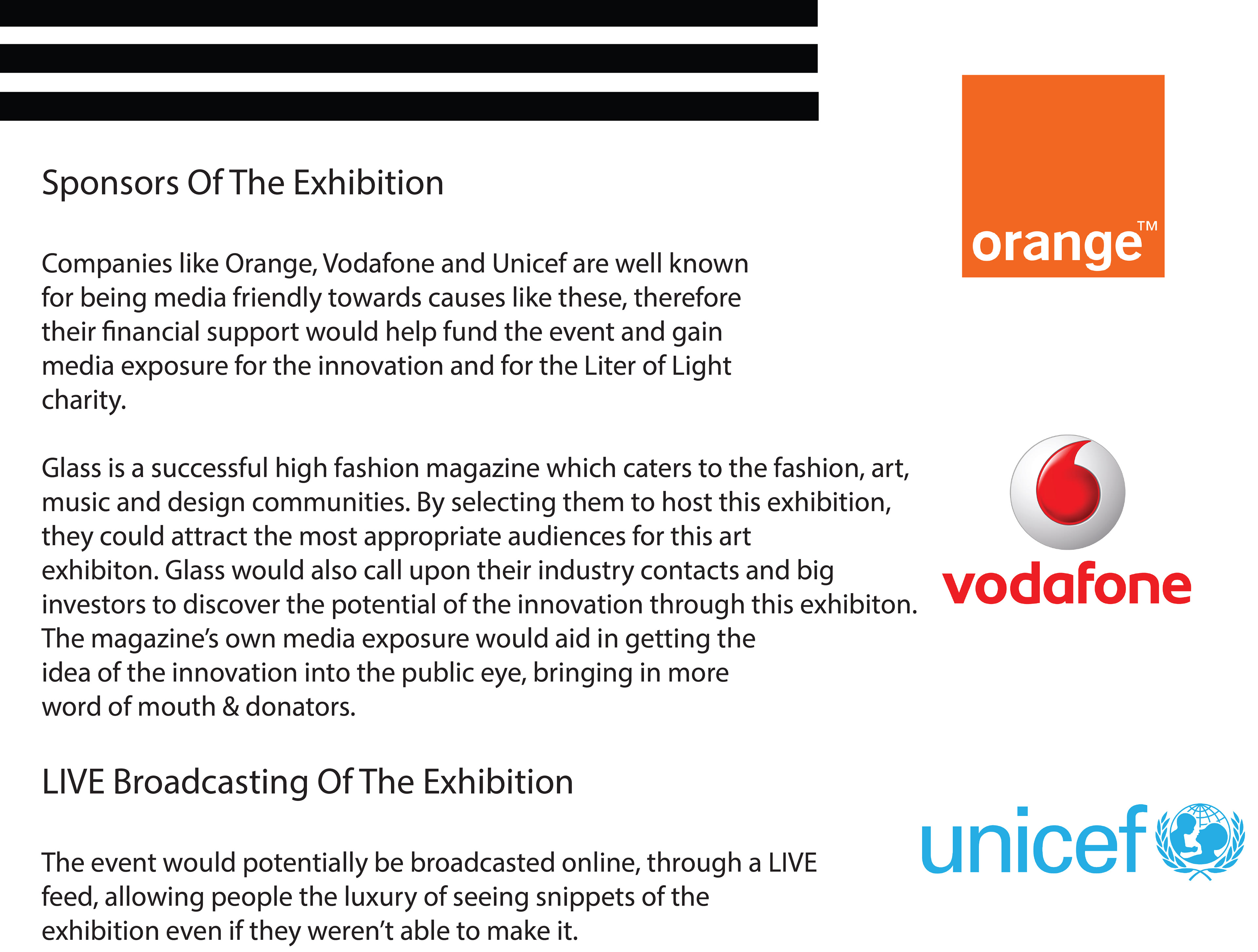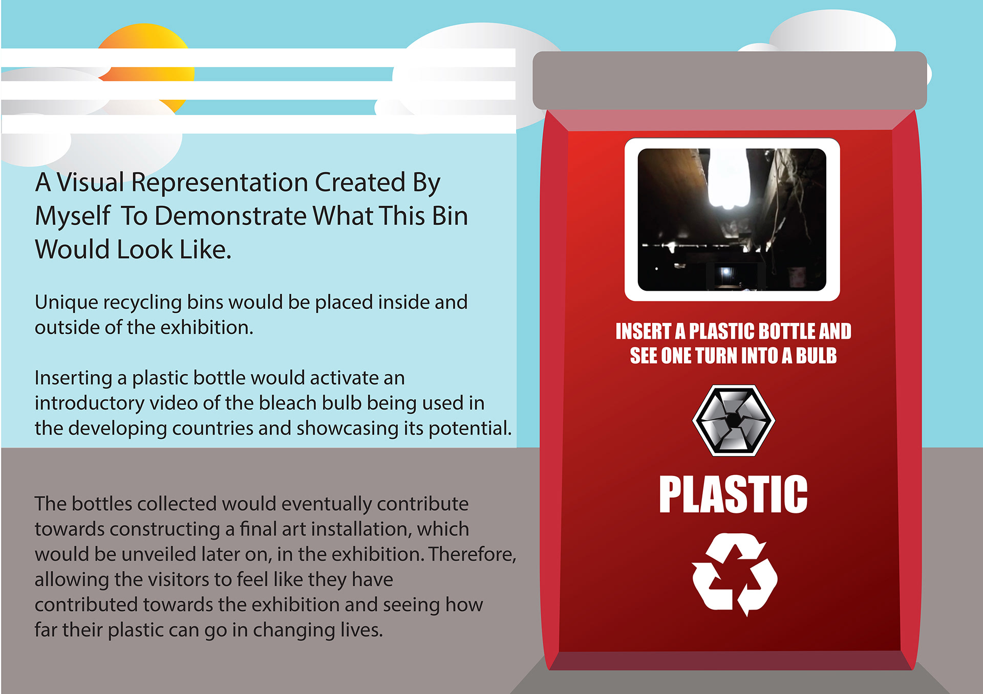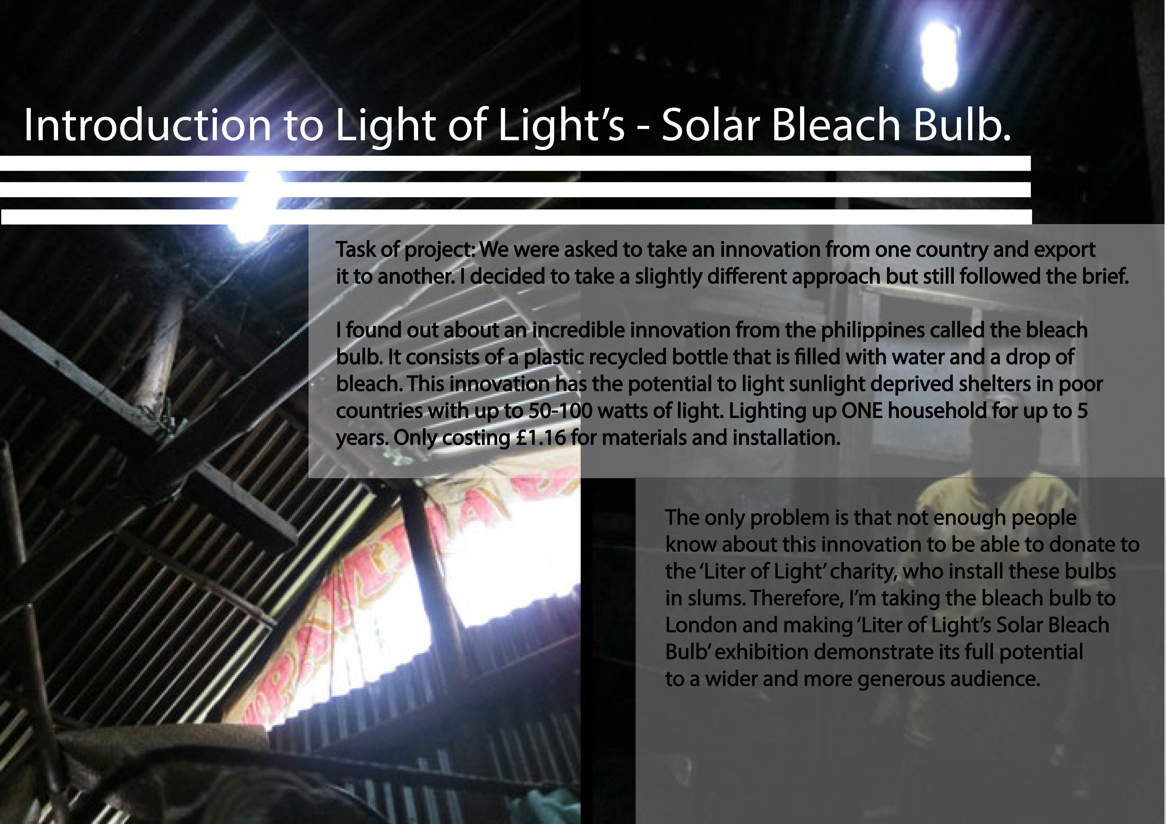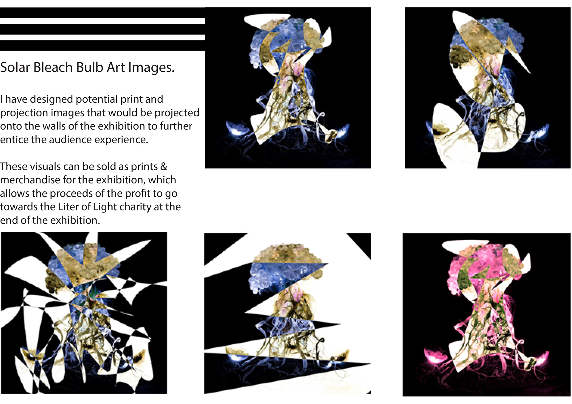 In response to an Import and Export University brief, I produced an art exhibition proposal which presents the potential for solar bleach bulbs in underprivileged countries to potential donators/ visitors.