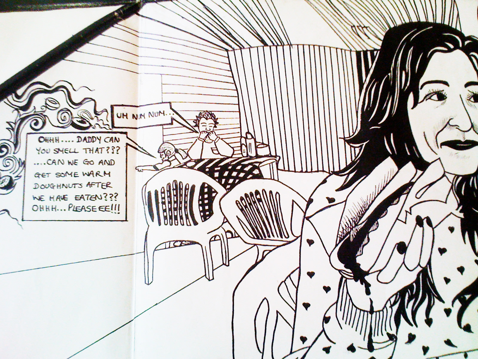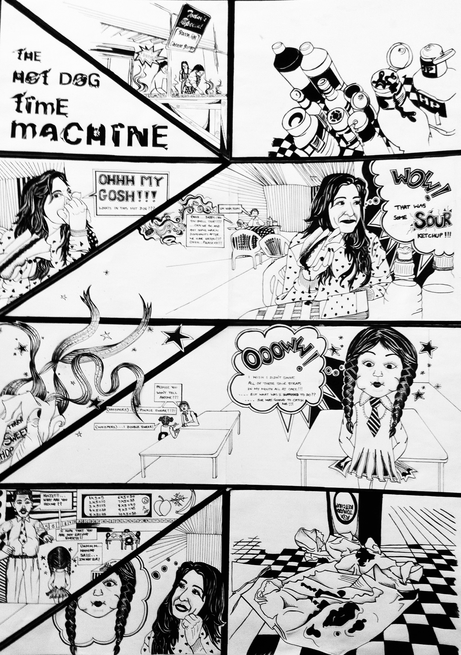 Adding tomato sauce to my hot dog was always like adding the cherry on the top to a brilliant Sunday walk around in our local market. However that particular Sunday was different, taking one bite out of that hot dog was horrible and sour, it tasted as though the tomato sauce had expired a couple of years ago. A range of senses had kicked in by then, and it instantly reminded me of the time when I was 5 years old and had snuck in a sour sweet into the classroom at school. For fear of my teacher catching me, I remember gobbling up all of the sour sweet, the feeling of the tomato sourness brought me back to my days in the classroom. Hence the name of my comic, 'the hot dog time machine'. I decided to create my own type out of existing typography to make this project truly unique. This tomato sauce was like a nostalgic device that took me back in time, an experience definitely worth illustrating.