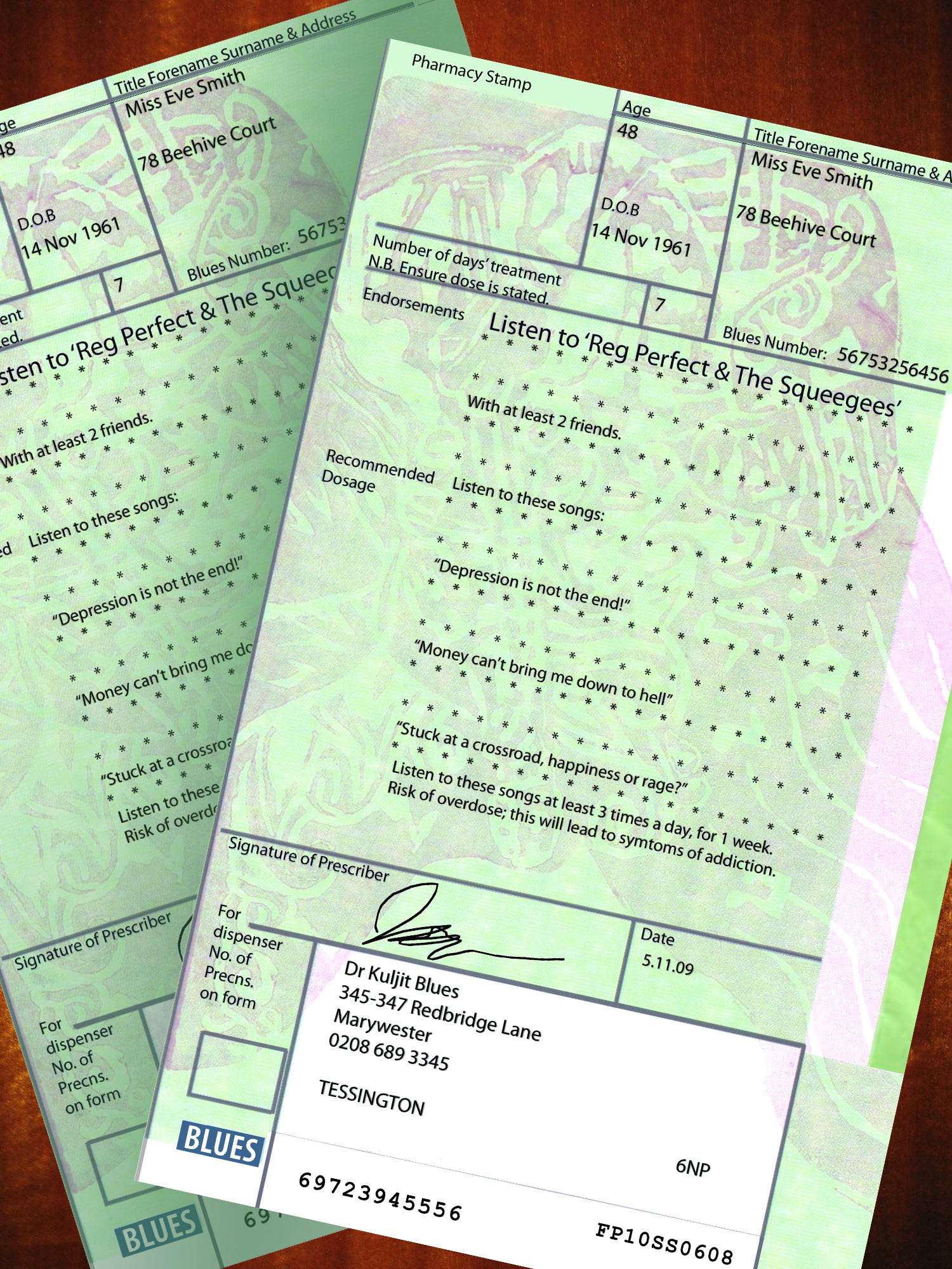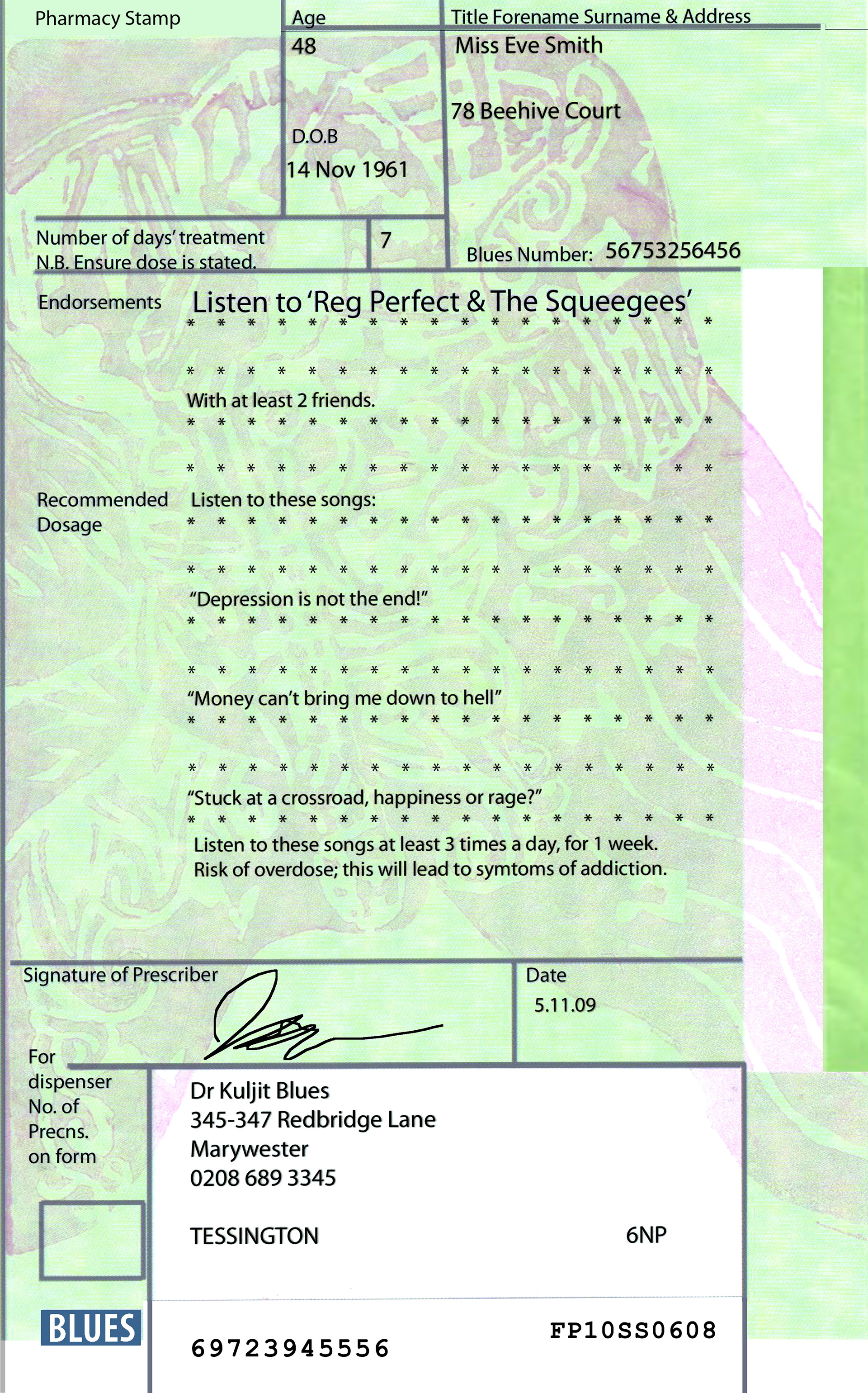 I prescribed a musical solution to the 21st century depression, listen to the Blues musical band Reg Perfect and the Squeegees, to soothe the worries away!
