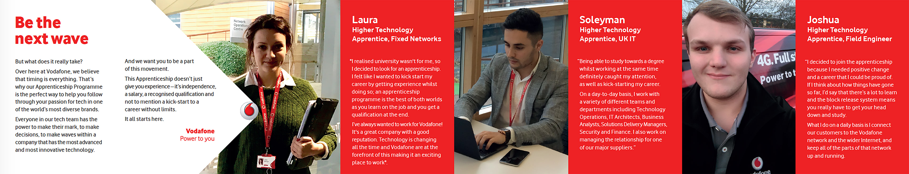 Agency: Tonic Agency Ltd Client: Vodafone Media: Event collateral My role: Copywriter Task: Vodafone were set to host the Apprentice Festival of Technology at their Newbury campus and came to us to produce and set a tone of voice for all their event communications. Our key audiences were students in the final year of their A-levels, careers advisors and teachers interested in encouraging their students into a career they felt passionate about. Idea: To create an array of event collateral to excite future tech apprentices onto a career path that ignites more than just the imagination. • Pre-event HTMLs directed to students and teachers • Z-cards to be given to students • Careers advisor leaflets • Pop-up banners Below is a sample of the z-card and HTMLs produced for this event.